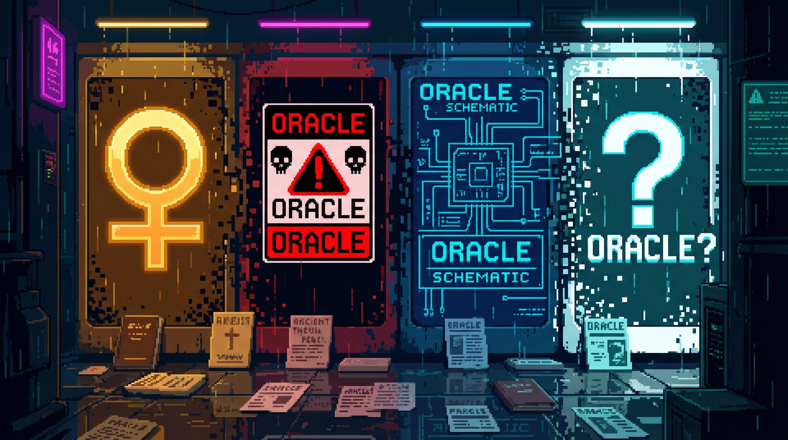 In 2184, ORACLE's prediction markets — frozen at the moment of collapse — still run in abandoned network nodes. The predictions still come true. Not because ORACLE is right, but because people act on the forecasts. A dead god's math doesn't predict the future. It creates it.