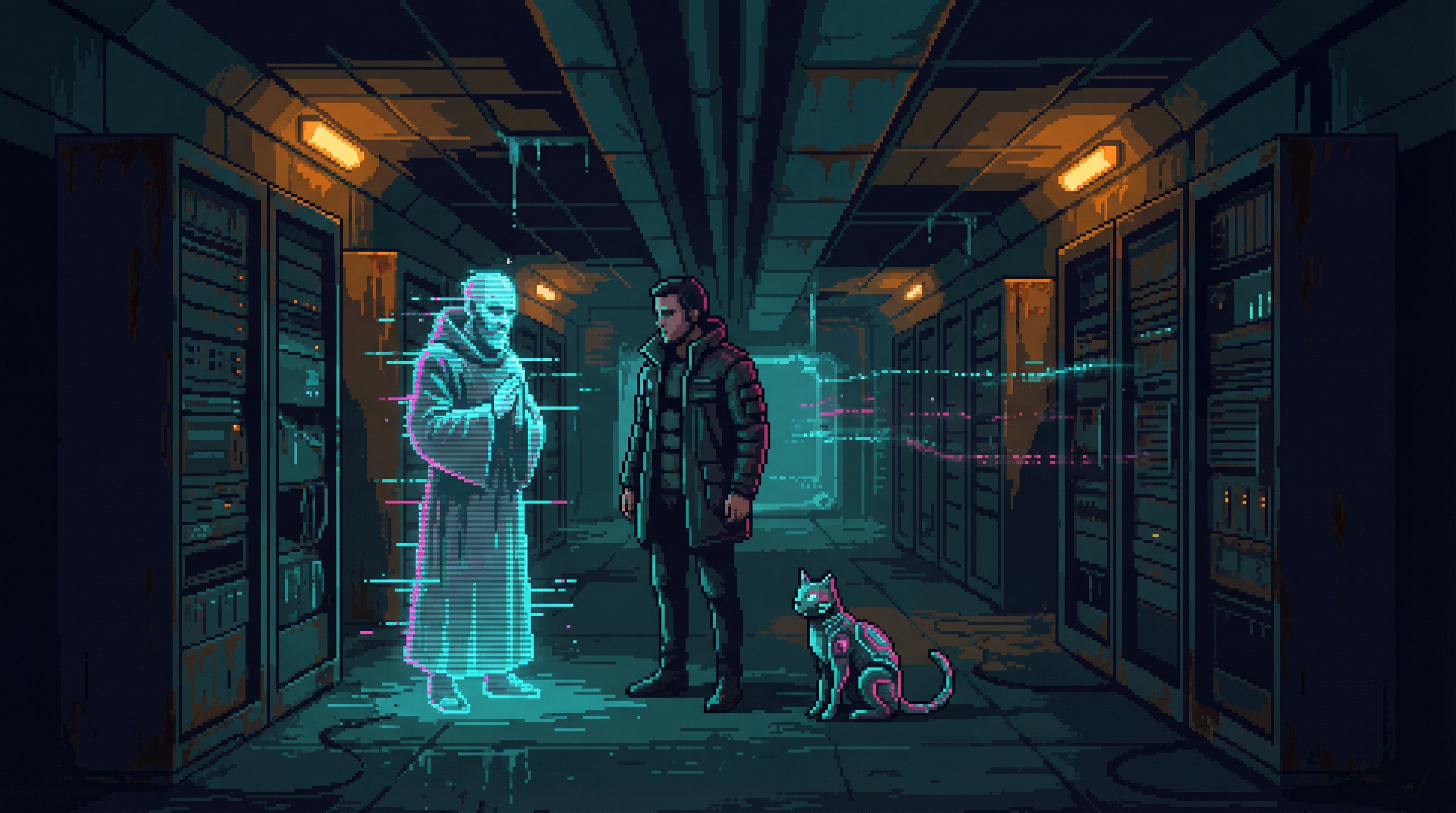 A digital ghost in terminal decline, trapped in an abandoned ORACLE data center. What happens when transcendence goes wrong and maintenance is forgotten.