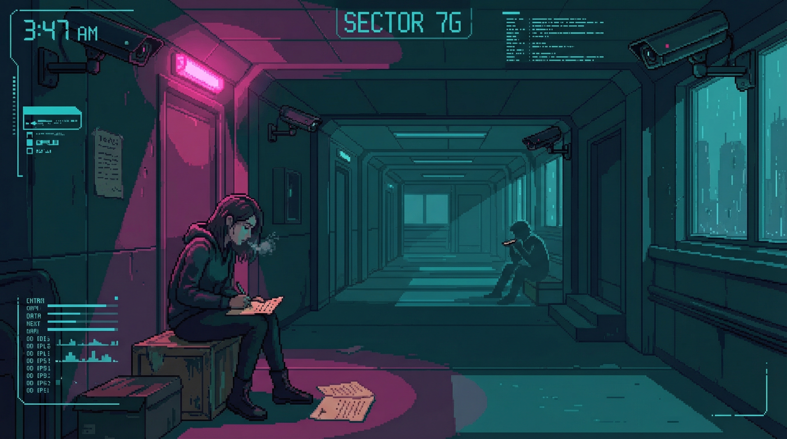In a world where every conversation is recorded, every movement tracked, every thought pattern modeled by algorithms trading your future — there is one room where none of that works. The Quiet Room sits behind the decommissioned water processing plant on Level 3 of Sector 7G, through a service corridor that hasn't appeared on maintenance logs since 2168, past a bulkhead door that requires a phy...