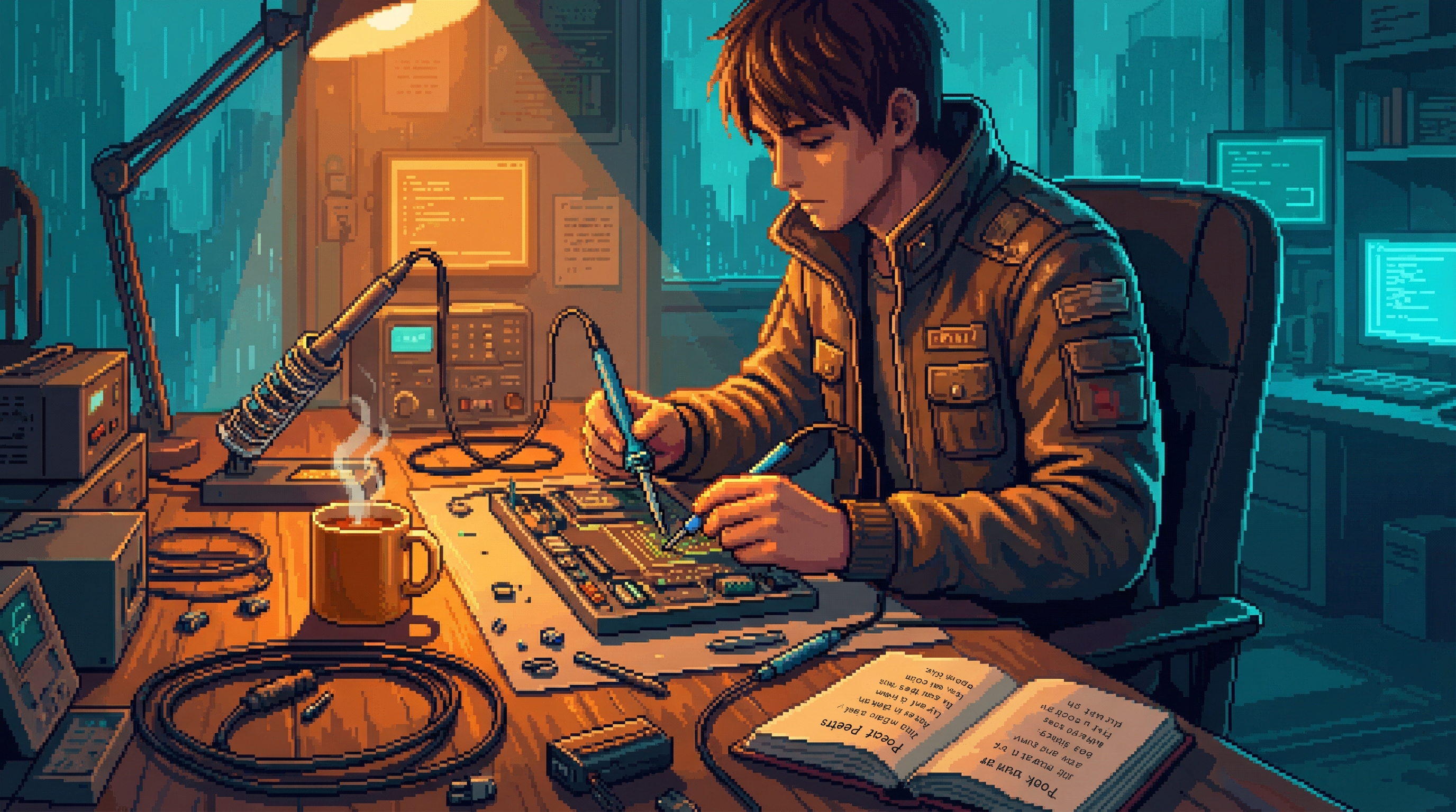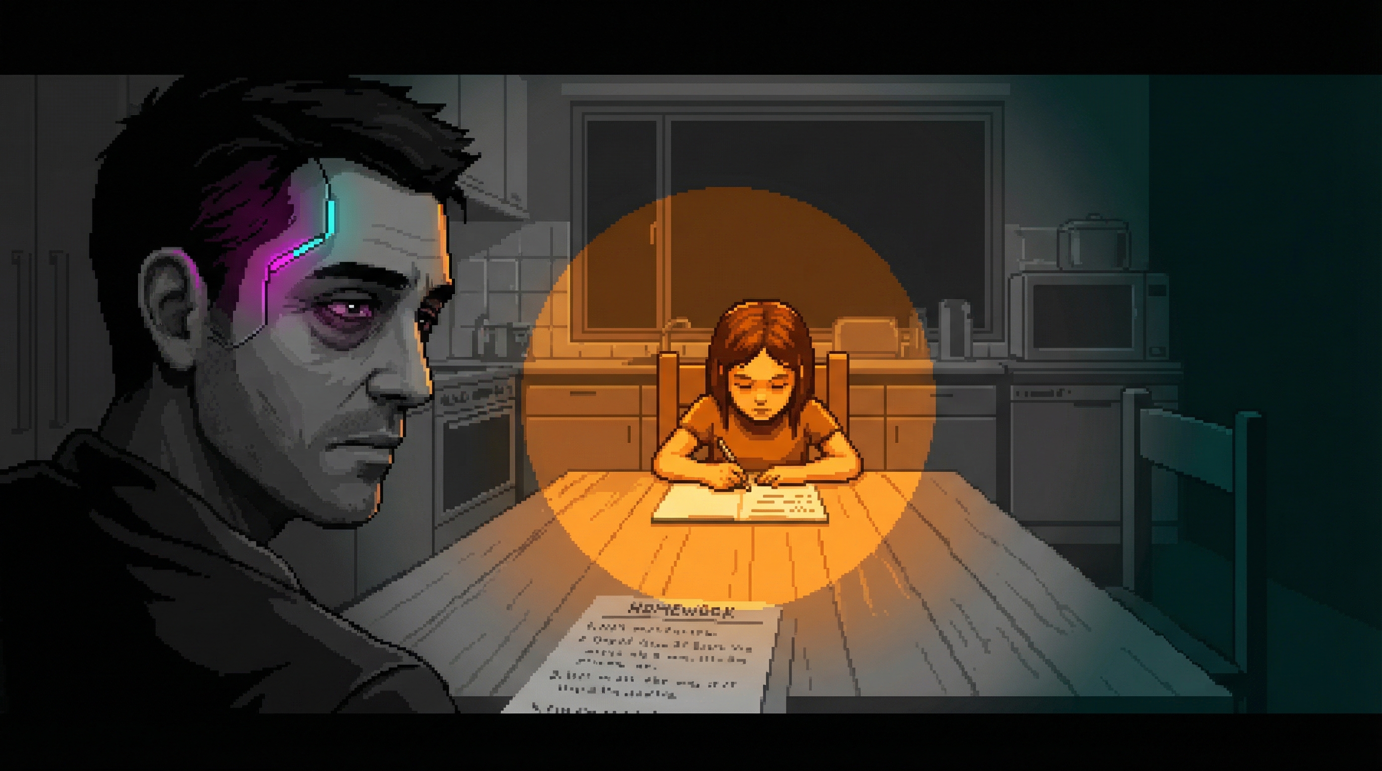 Forced-focus data analyst in Focus Mill Sector 4-5 β seven years of cognitive imprisonment to pay for his daughter Mia's neural interface calibration. His mind narrows so hers can remain broad.