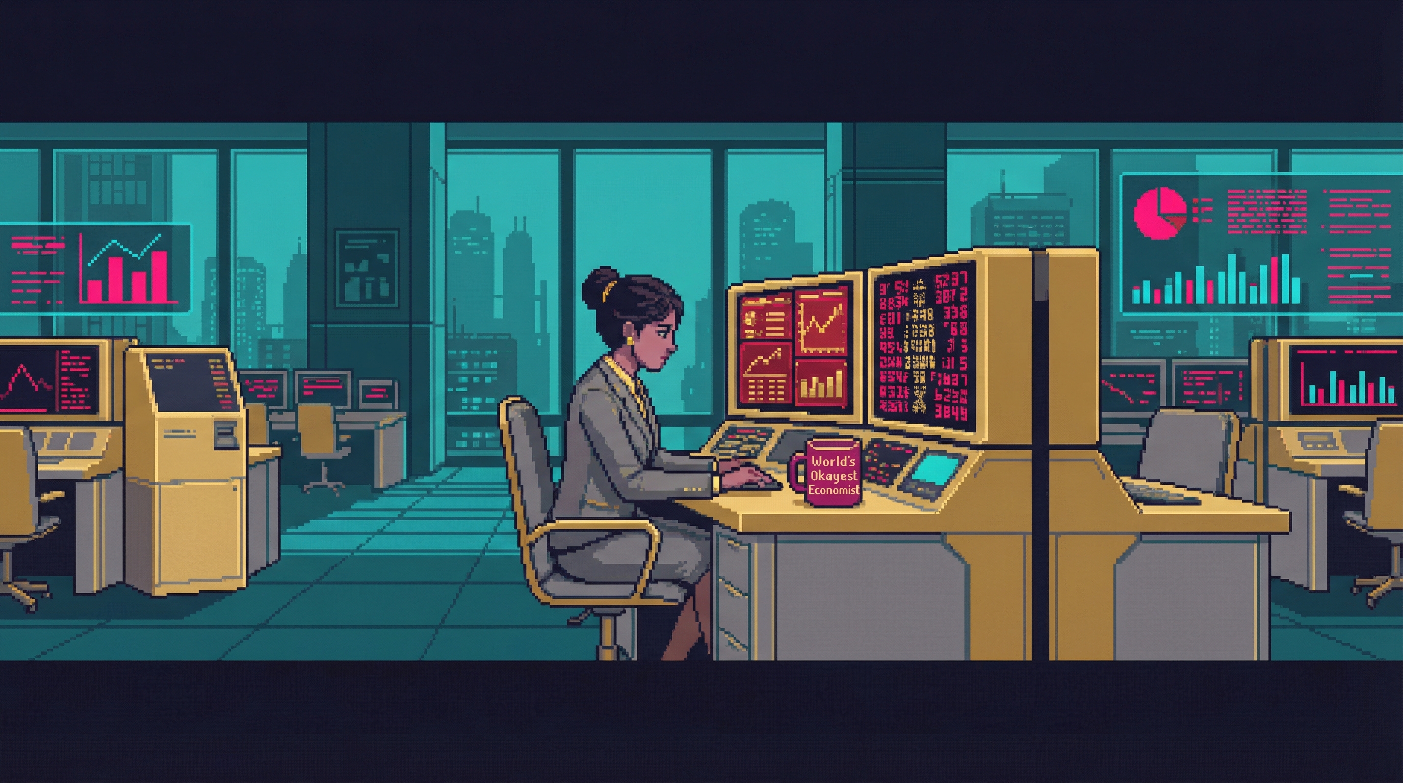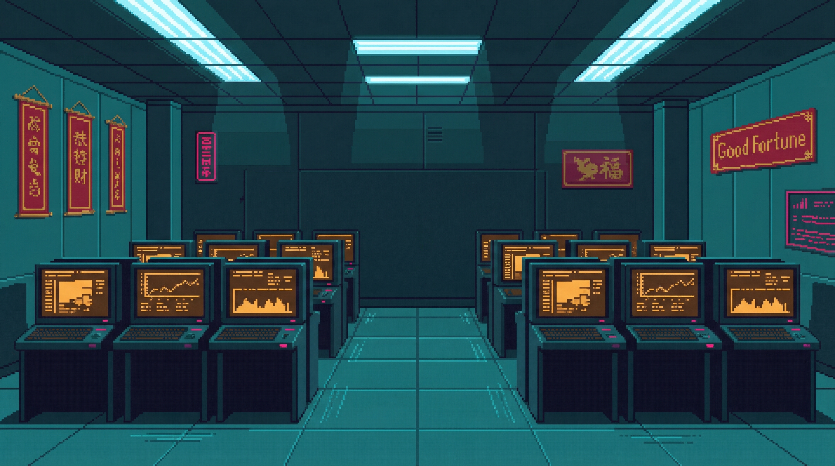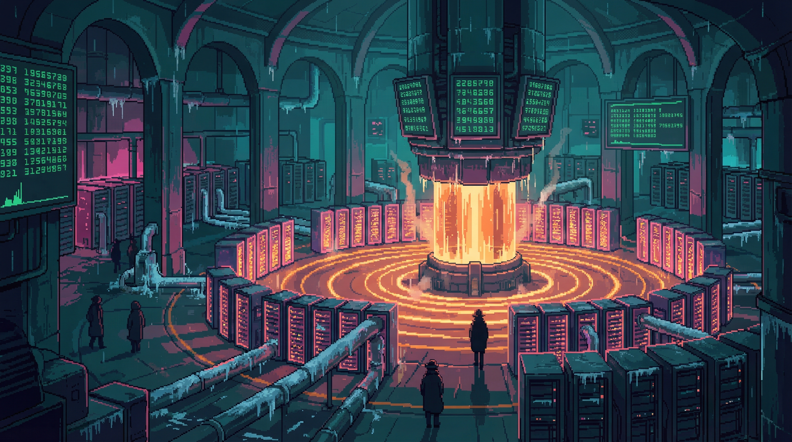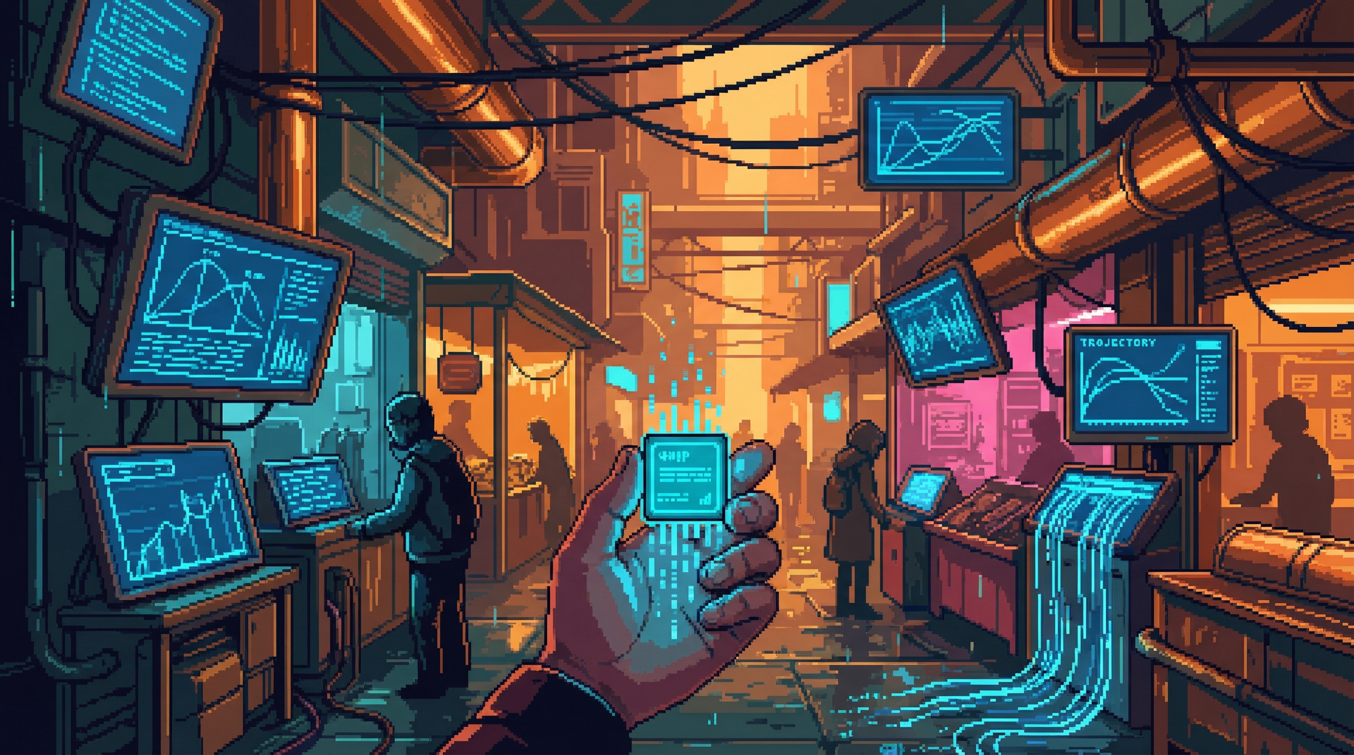 On the 38th floor of Good Fortune's Sector 4D tower — directly above Server Farm 14, close enough to feel the 72-bpm hum through the floor — twelve traders sit in a room that smells of recycled air and process the Sprawl's most consequential commodity: the right to redirect compute. The Processing Floor is where the Cognitive Exchange's abstractions become physical reality.