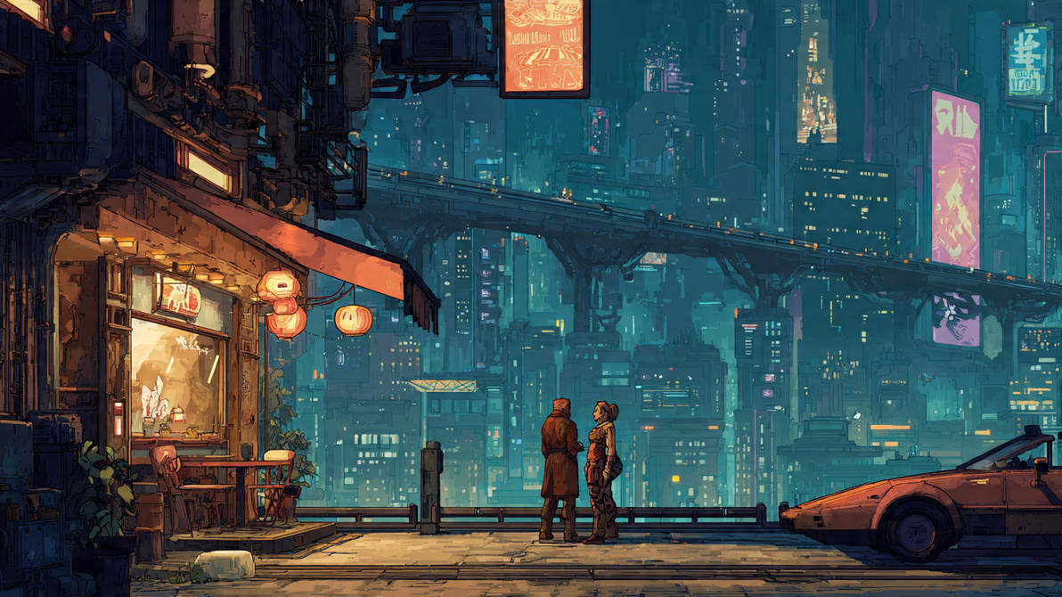 Handcrafted pixel art meets dynamic cyberpunk atmosphere. Explore the art style โ
