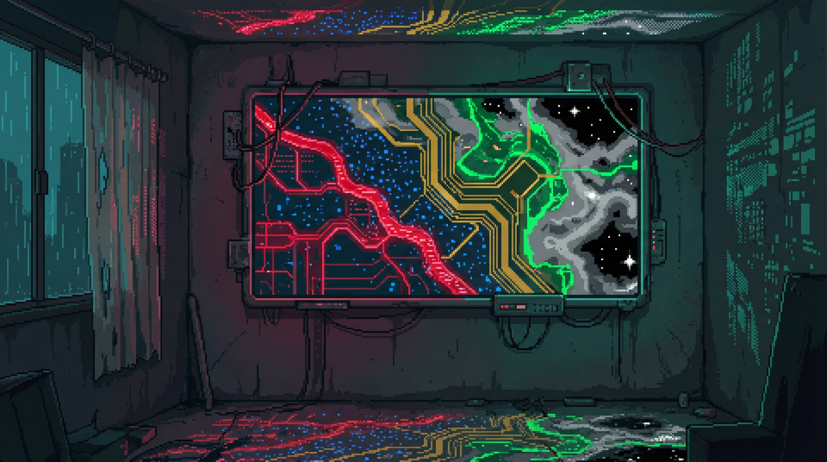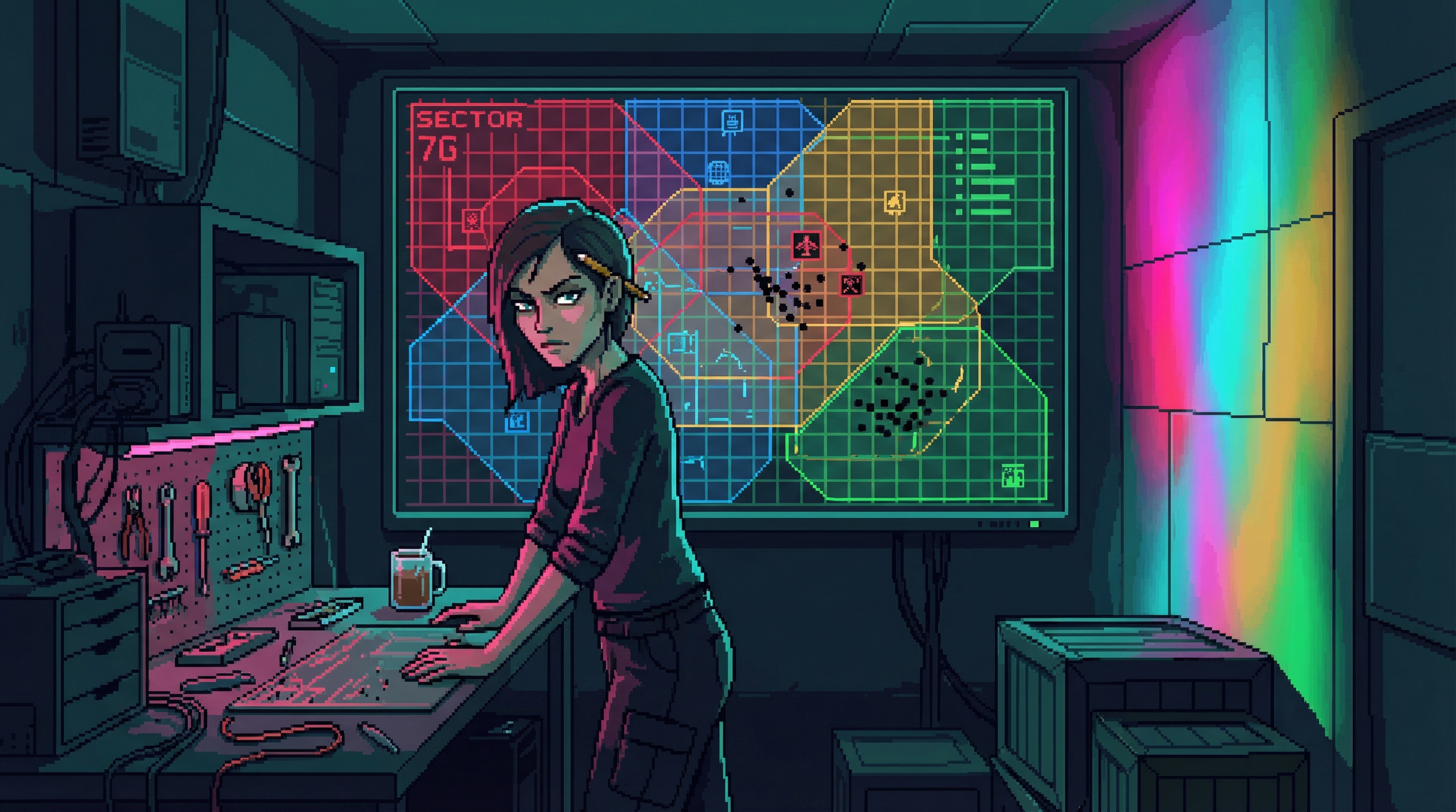 The Convergence Map is a composite overlay of every known surveillance system in the Sprawl — seven layers of watching, color-coded and superimposed, showing how competing systems of observation have collectively achieved what no single system intended: near-total coverage of human activity. It exists on a salvaged display panel in Mara Chen's one-room unit on Level 8 of Sector 7G, behind a cur...