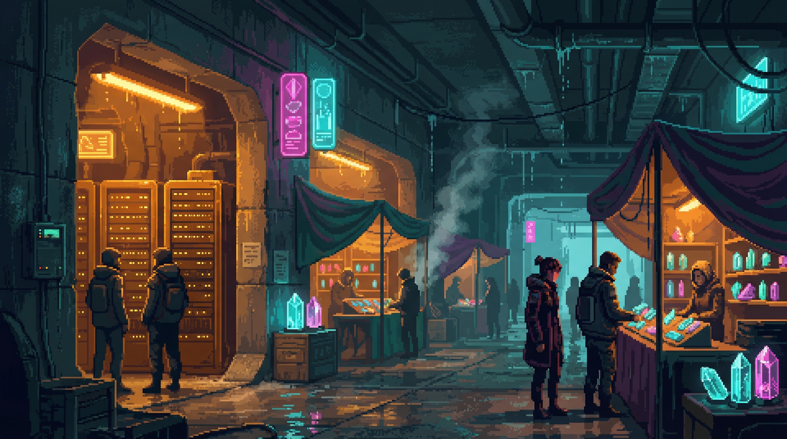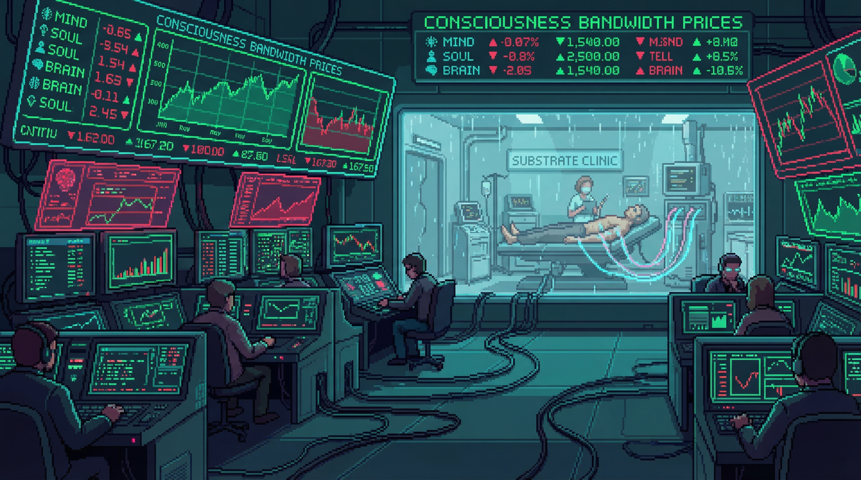 Consciousness is the Sprawl's most valuable commodity, and like all valuable commodities, it has a market. The cognitive bandwidth market is the financial infrastructure through which processing capacity — the raw material of thought — is bought, sold, hedged, speculated upon, and derivatized into financial instruments that most Basic-tier users lack the cognitive capacity to understand.