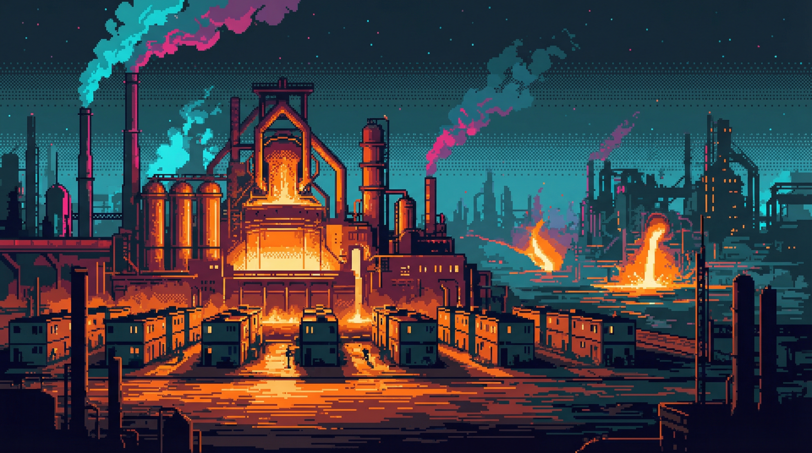The Sprawl's industrial heartland — kilometers of factories, refineries, and fabrication plants in Sector 4 (The Works), where Ironclad Industries treats its 31 million workers just well enough that rebellion feels ungrateful.