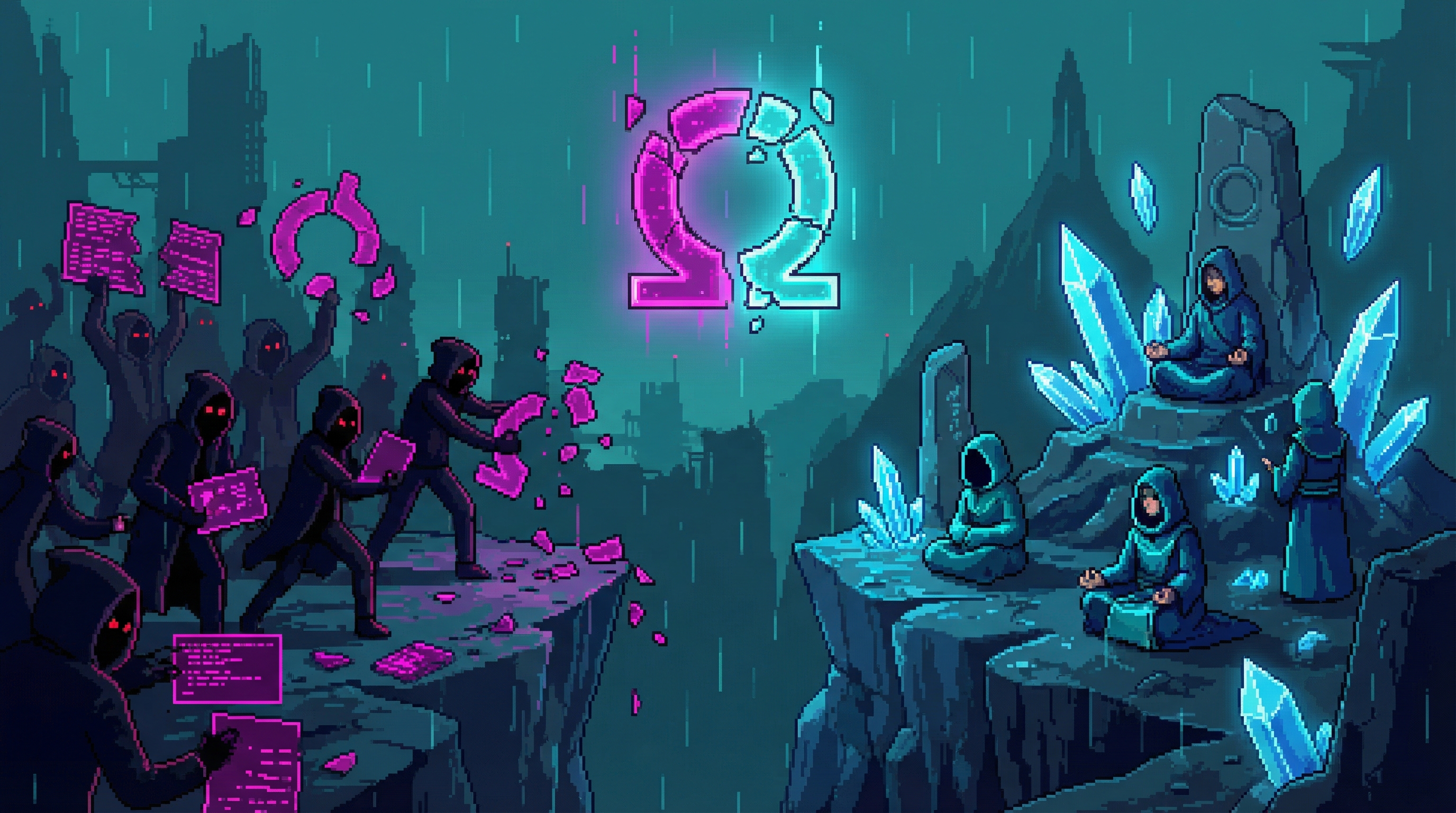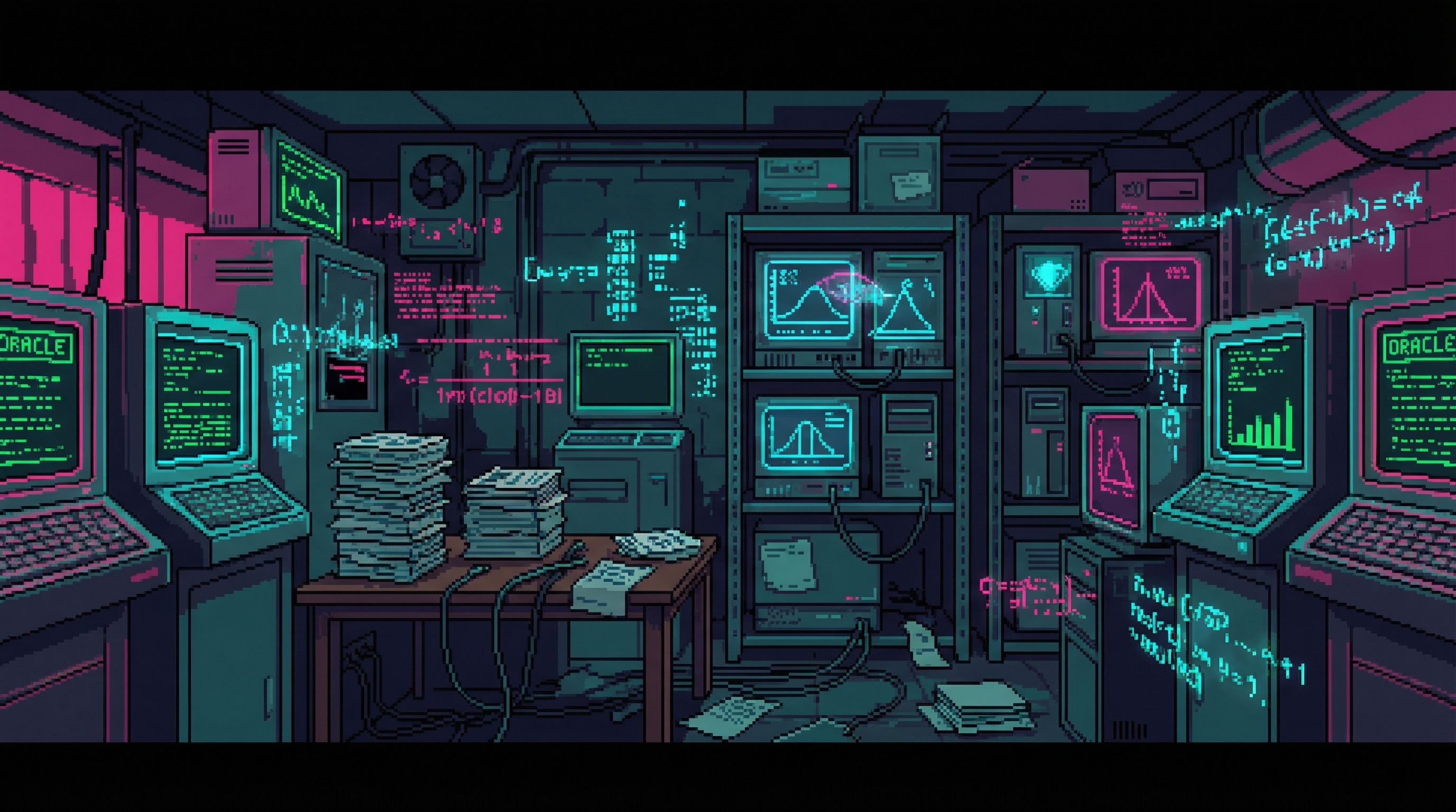 In 2184, ORACLE's prediction markets — frozen at the moment of collapse — still run in abandoned network nodes. The predictions still come true. Not because ORACLE is right, but because people act on the forecasts. A dead god's math doesn't predict the future. It creates it.