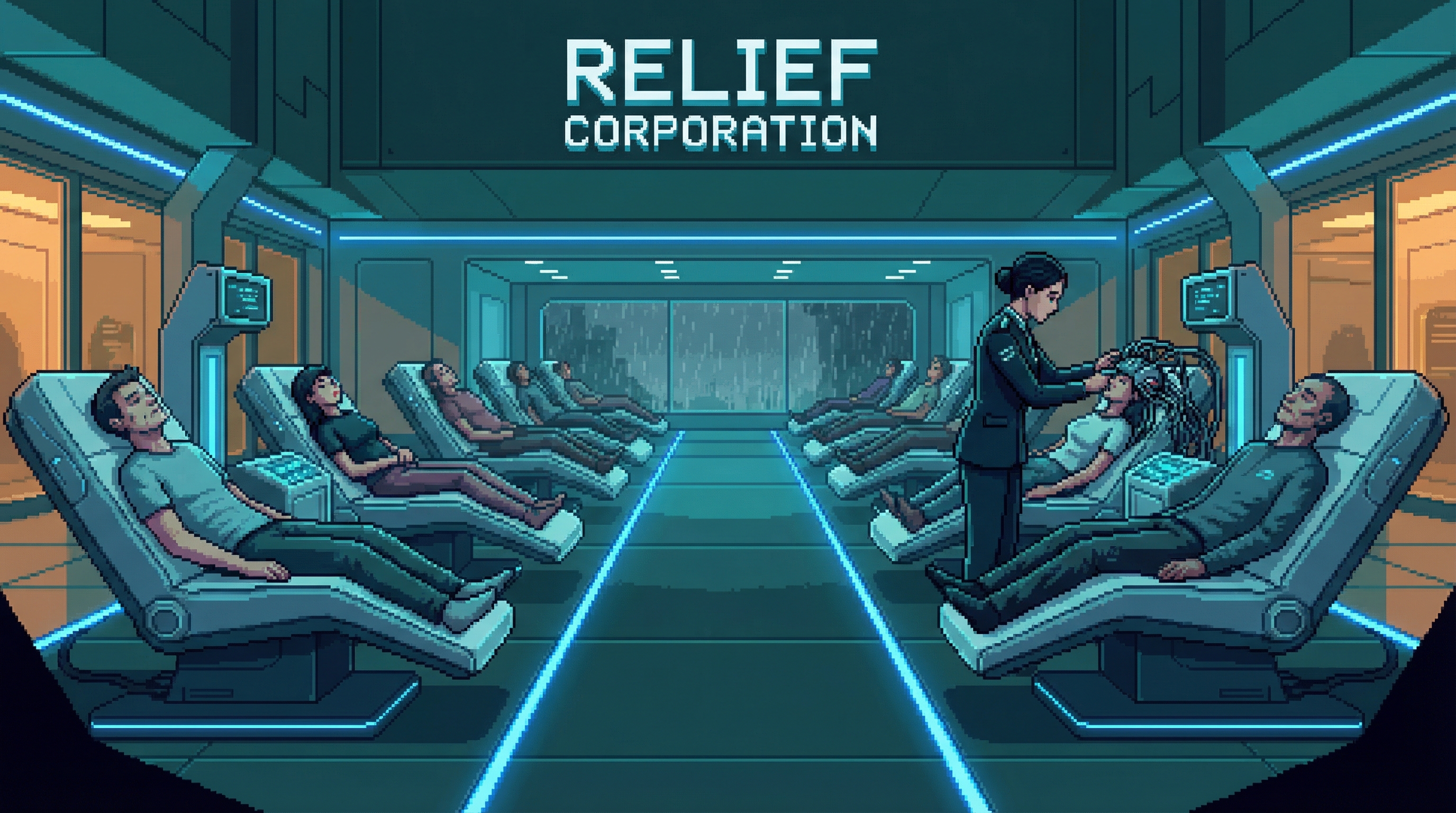Relief Corporation operates 2,400 Somnolence Parlors across the Sprawl — branded wellness venues offering "curated unconscious experiences" to customers who can't dream naturally and can't afford (or won't risk) black-market harvested dreams. The Parlors are beautiful.