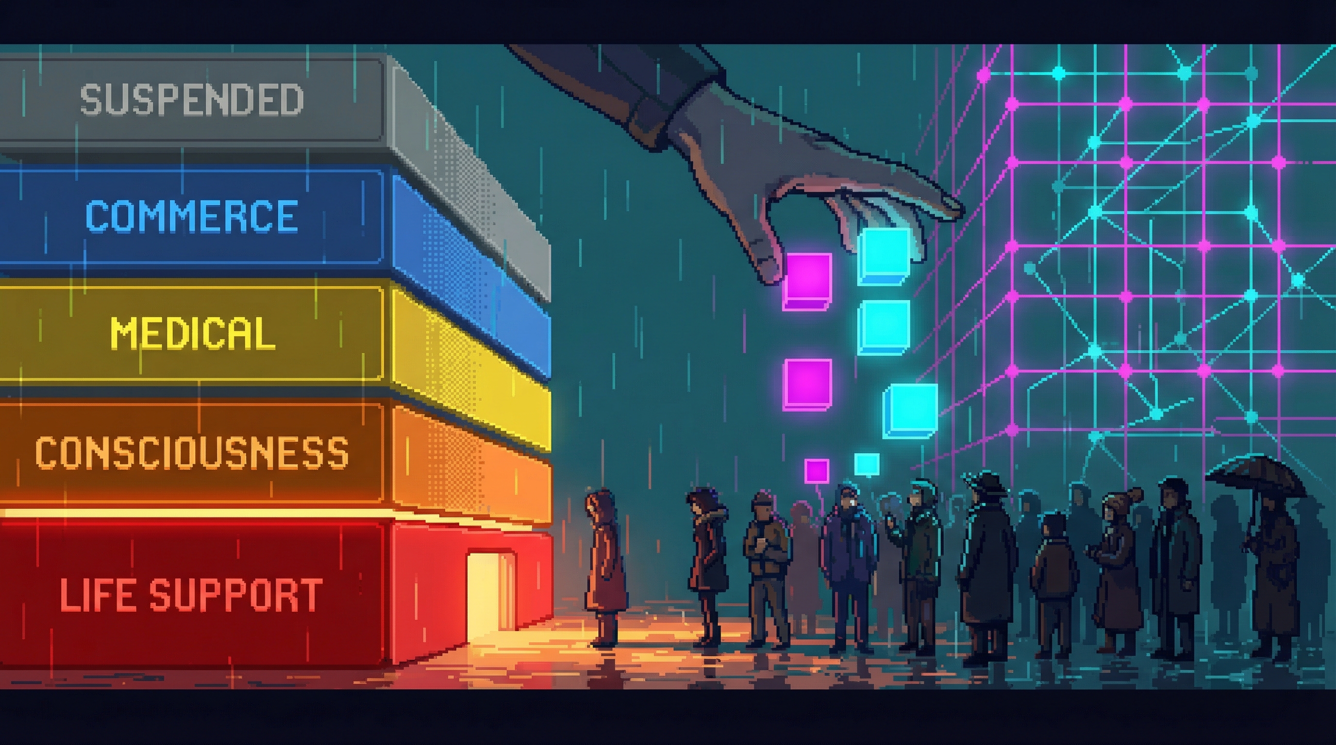 During severe compute droughts, the interstitial zones implement informal rationing — a triage model that distributes whatever processing capacity remains according to five priority levels: life support first, consciousness maintenance second, medical third, commerce fourth, everything else last. The rationing follows a model adapted from medical triage protocols by Councillor Nwosu's staff aft...